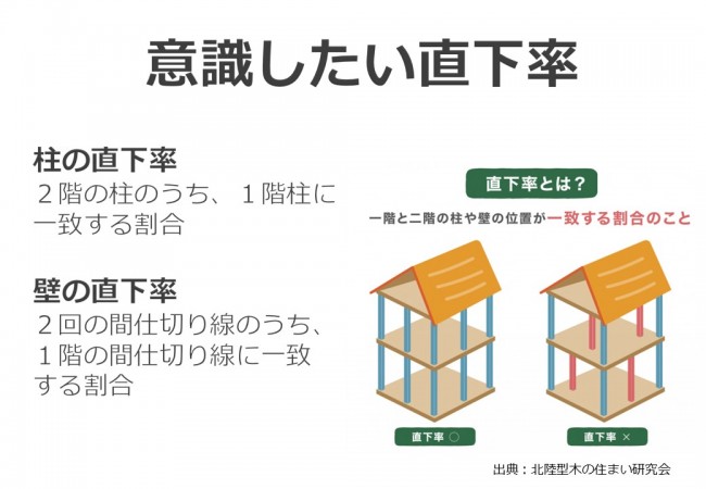 直下率とは、1階と2階の構造壁や柱が直下にある率を言います。