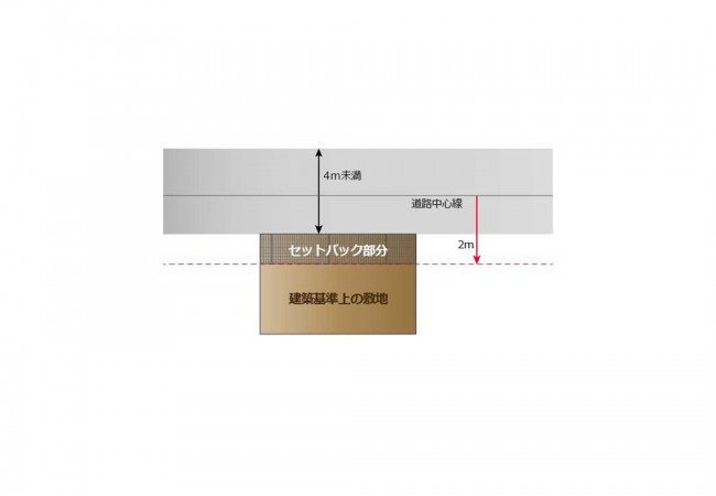 セットバックとは、道路幅を将来的に4m確保するために、敷地の一部を道路側に提供し、道路中心線から2mの位置まで敷地境界を後退させる考え方です。